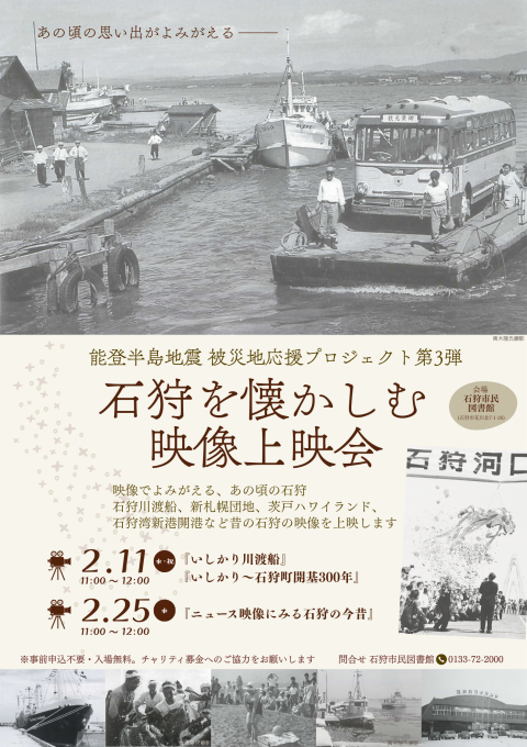 石狩川渡船、新札幌団地、茨戸ハワイランド、石狩湾新港開港など、かつての石狩の貴重な映像を上映。