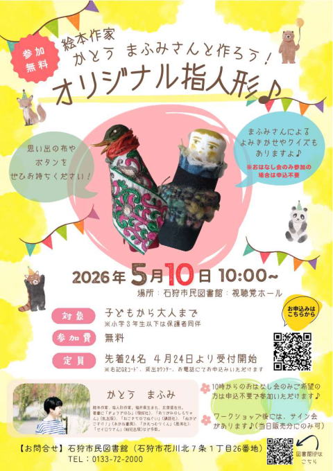 絵本作家のかとうまふみさんをお招きし、指人形を作るワークショップを開催します!思い出の布やボタンをぜひお持ちいただき、自分だけのオリジナル指人形を作りましょう!読み聞かせやクイズもありますので、足を運んでみてください♪ワークショップ後にサイン会を開催します!(当日販売分にのみサインします)