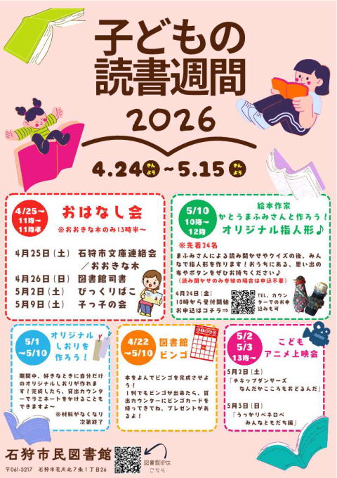 石狩市民図書館では、こどもの読書週間にあわせてお子さんや、多くの方に本に親しみをもっていただけるよう色々な行事を開催します。